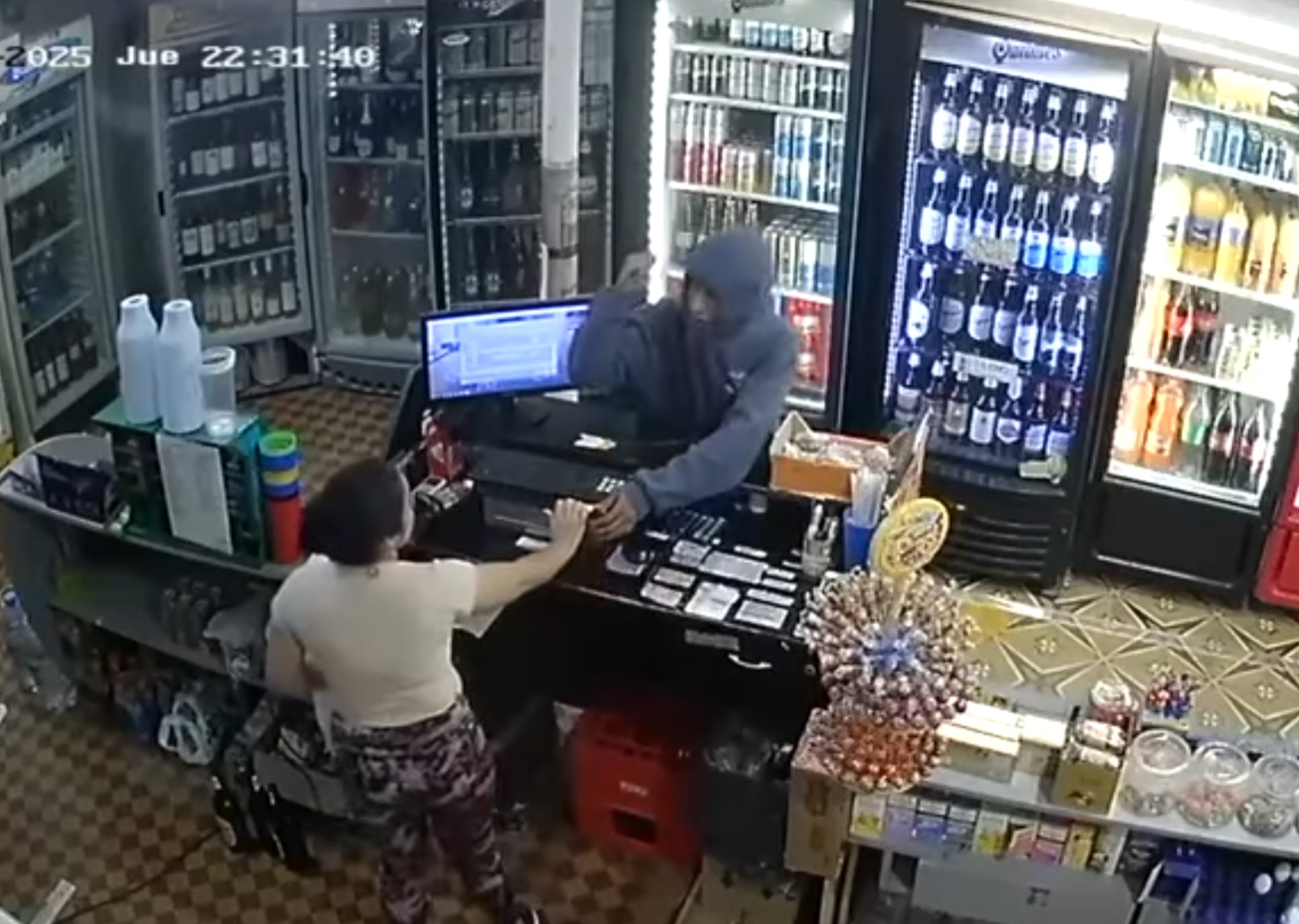 Según se puede observar en las imágenes captadas por una cámara de seguridad, el delincuente, vestido con buzo oscuro y capucha, amenazó a la trabajadora que se encontraba detrás del mostrador e intentó arrebatarle la caja que contenía el dinero. La empleada se resistió en un primer momento, intentando frenar el accionar del sujeto con determinación.